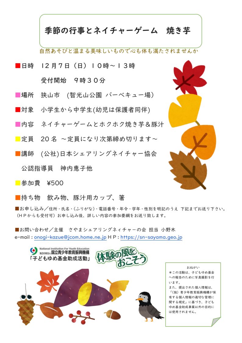 内 容:ネイチャーゲームとホクホク焼き芋&豚汁